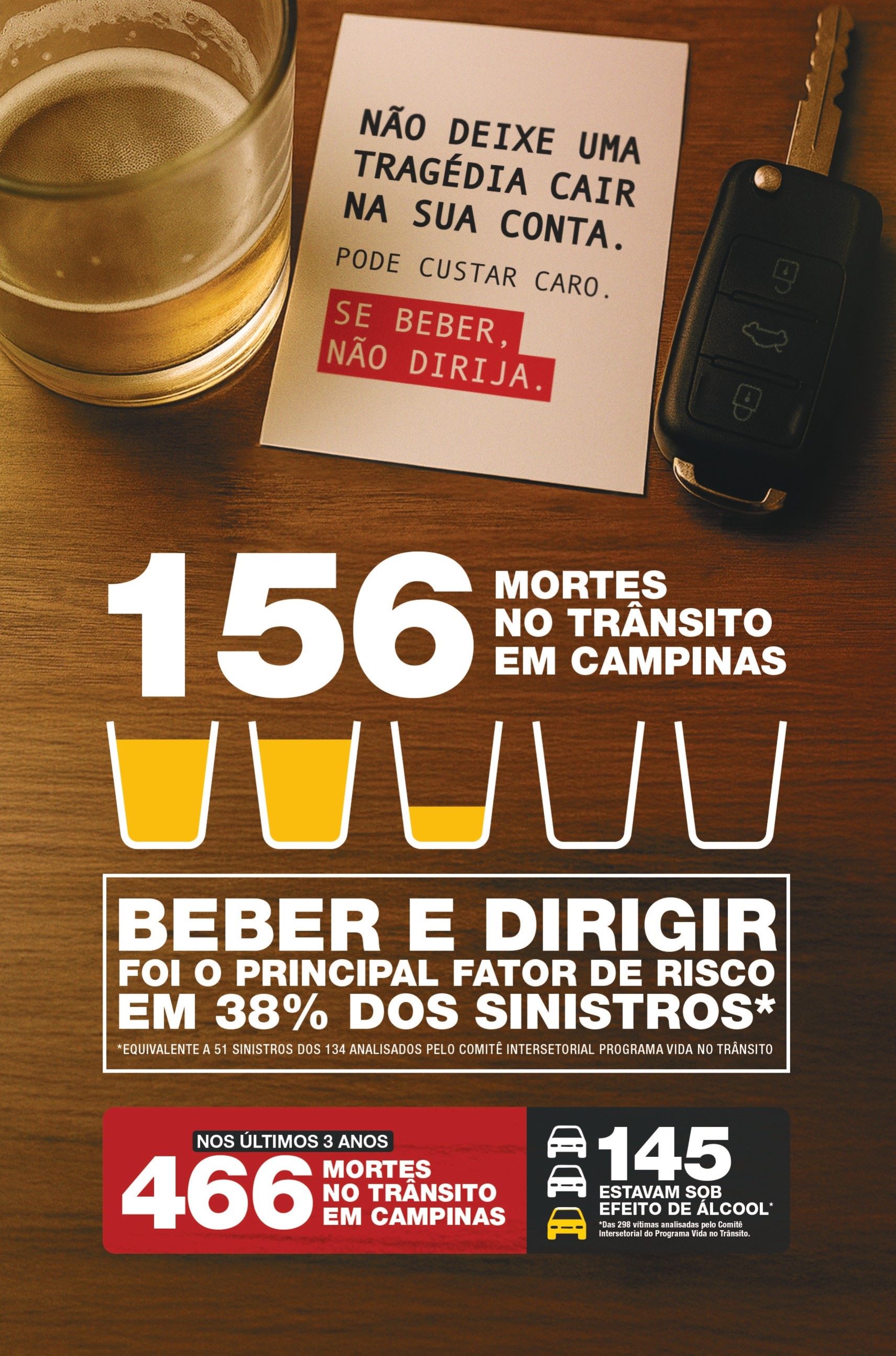 A combinação entre direção e bebida alcóolica esteve presente em 51 (38,1%) dos 134 sinistros (acidentes) analisados nas vias urbanas de Campinas em 2024.