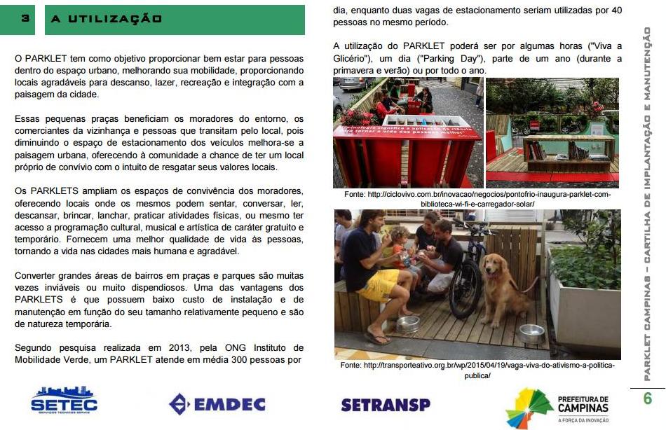 A Emdec, a Secretaria Municipal de Planejamento e Urbanismo (Seplurb) e a Serviços Técnicos Gerais (Setec) estão trazendo para Campinas o conceito de parklet (também chamado de “zona verde”, “vaga viva” ou “varanda verde”), intervenção urbana adotada internacionalmente para devolver às pessoas espaços públicos antes utilizados como estacionamento de automóveis, transformando essas vagas em locais de lazer e socialização.
