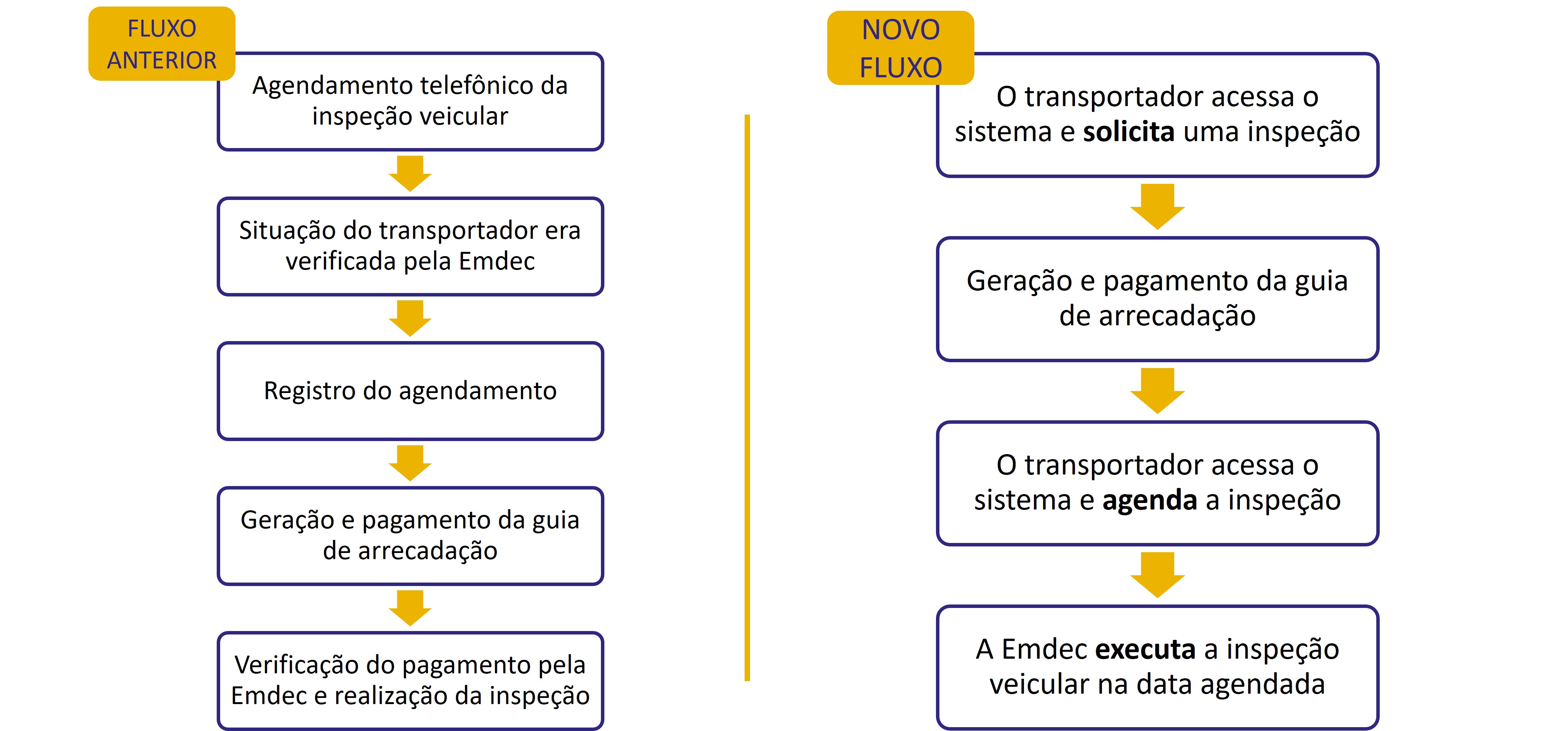 O novo recurso moderniza e agiliza uma importante etapa do processo de emissão da permissão. No fluxo anterior, o permissionário gerava a guia de arrecadação para pagamento somente após o agendamento telefônico da inspeção veicular. Cabia à Emdec verificar a situação do pagamento no momento da inspeção. Todo o processo era reiniciado nos casos em que o pagamento não era confirmado.